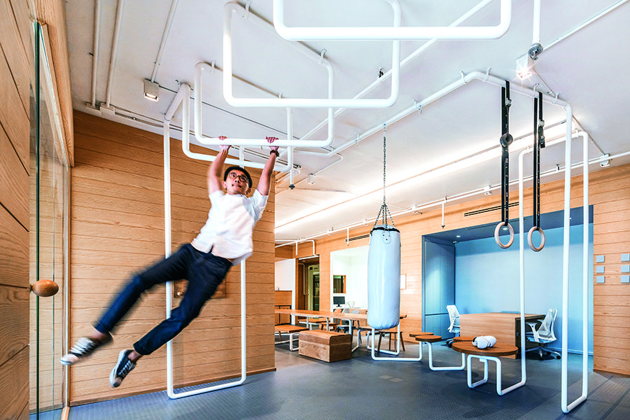 ฉีกกฎออฟฟิศรูปแบบเดิมด้วยสเปซสำหรับออกกำลังกายสุดรีแล็กซ์ ไอเดียดีๆ ที่ Inteltion Office ที่ให้ความสำคัญถึงการลดปัญหาโรคออฟฟิศซินโดรม ที่มักจะเกิดขึ้นกับพนักงานประจำส่วนใหญ่ ที่ต้องขลุกตัวอยู่แต่ในพื้นที่เดิม ๆ ตลอดทั้งวัน โดยไม่มีโอกาสได้เปลี่ยนอิริยาบถอย่างอิสระ โดยการรีโนเวตพื้นที่ขนาด 170 ตารางเมตร บนชั้น 14 ของอาคารพหลโยธินเพลสขึ้นใหม่ ให้มีฟังก์ชันที่สามารถออกกำลังกายได้ให้กระจายตัวอยู่ 12 จุดทั่วทุกพื้นที่ในออฟฟิศ เพื่อช่วยสร้างเสริมสุขภาพกาย และสุขภาพจิตที่ดีให้พนักงาน