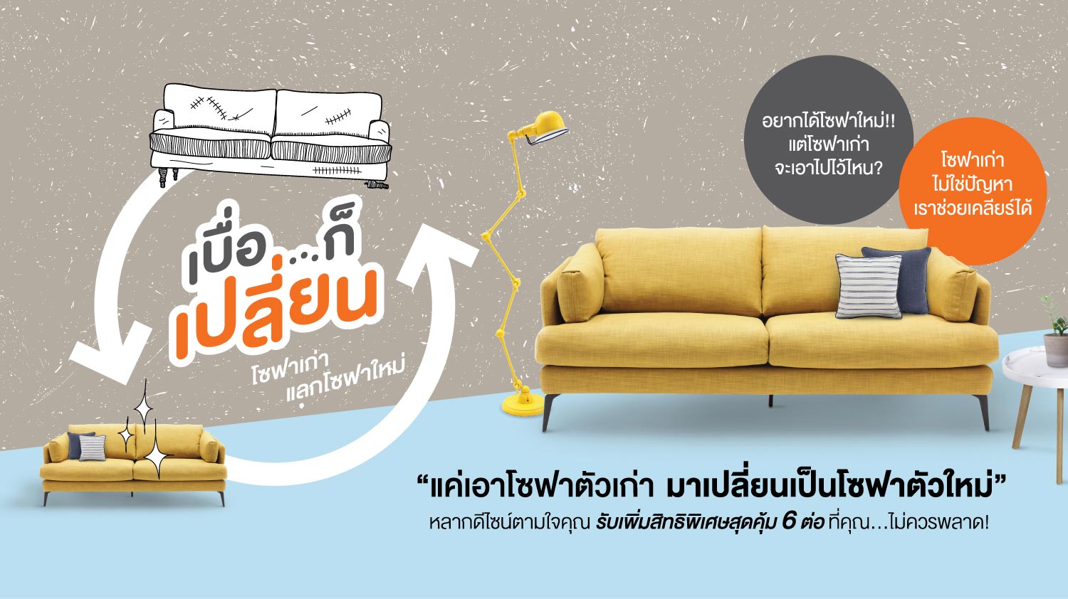 และที่พิเศษสุดคือ โซฟาเก่าของคุณ สามารถนำมาแลกเป็นส่วนลดในการซื้อโซฟาตัวใหม่ได้ด้วย มูลค่าสูงสุดถึง 15,000 บาท ง่ายๆ เลยแค่ถ่ายรูปโซฟาเก่ามาโชว์ตอนมาซื้อโซฟาใหม่ที่ SB Design Square และเมื่อทีมช่างเอาโซฟาตัวใหมไปส่ง ก็จะเคลียร์โซฟาเก่าออกไปให้ด้วย เป็นการเอาโซฟาเก่ามาเทิร์นเป็นโซฟาใหม่ นอกจากนี้ยังมีโซฟาอีกหลากหลายสไตล์ ที่ลดสูงสุดกว่า 70%