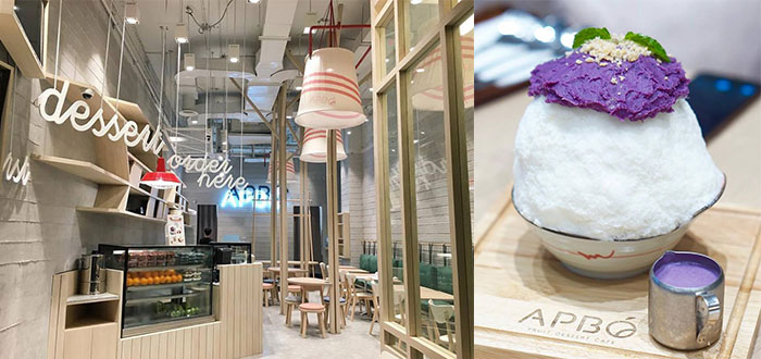 APBO (แอ๊บโบ๊ะ) คาเฟ่ที่ขายน้ำแข็งไสสไตล์ญี่ปุ่น หรือที่เรียกกันว่า Kakigori แค่ชื่อร้านก็น่ารักน่าหยิกขนาดนี้ โดยชื่อร้านAPBOนี้ย่อมาจาก A-Apple , P-Papaya , B-Banana และ O-Orange เป็นผลไม้ที่ถูกใช้เป็นส่วนประกอบหลักของร้าน ใครที่เดิน The Promenade คงคุ้นหูกับร้านนี้แน่ๆเลย ส่วนเมนูม่วงๆของที่ร้านนี้แนะนำเป็น Sweet Potato & Coconut น้ำแข็งไสปั่นกับนมเนื้อเนียน ท็อปด้วยมันเทศสีม่วงบด เคียงคู่มากับมันม่วงบดผสมน้ำกะทิและเนื้อมะพร้าวอ่อน