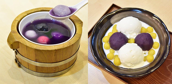 ทิ้งท้ายเมนูมันม่วงไปด้วยร้านเก่าแก่ย่านเยาวราชที่เปิดกว่า 20 ปี อย่าง Sweet Circle ร้านของหวานเล็กๆที่มีพระเอกเป็นบัวลอยน้ำขิง ตอนนี้ขยายสาขามาเปิดที่สวนหลวงสแควร์เพื่อเอาใจกลุ่มนักศึกษาด้วยการปรับโฉมร้านและเมนูใหม่อย่างเมนู บัวลอยมันม่วง บัวลอยที่เอาน้ำขิงเข้าไปผสมกับน้ำมันม่วง พร้อมแป้ง เหนียวนุ่มแบบต้นตำรับ ห่อมากับไส้ทั้งหมด 4 รส คืองาดำลาวา ไส้ถั่วแดง ไส้เผือก และสุดท้ายไส้มันม่วง ทานคู่กับน้ำขิงร้อนๆ มีกลิ่นหอมอ่อนๆจากน้ำมันม่วง หวานๆเผ็ดๆ กินแล้วชุ่มคอ หรือถ้ายังม่วงกันไม่พอต้องเมนูนี้เลยค่ะ Double Purple มันม่วงล้วนลูกกลมๆ เสิร์ฟมาพร้อมบัวลอยฟักทองเคียงคู่มากับไอศกรีมกะทิและนมสด