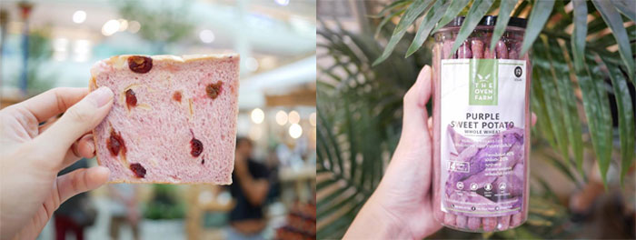 ใครคิดว่าอาหารที่มีประโยชน์ ไม่มีไขมัน จะไม่อร่อยเสมอไป The Oven Farm ลบความคิดแบบนั้นออกไปจนหมดสิ้นเลยค่ะ ที่นี่ผลิตขนมปังเพื่อสุขภาพ ไม่ใส่นม เนย ไข่ และไขมันจากพืชและสัตว์ทุกชนิด เรียกได้ว่าคัดสรรวัตถุดิบทุกชนิดที่สดใหม่ ผ่านกระบวนการผลิตที่สะอาด ปลอดภัย ผู้ป่วยและผู้ที่จำกัดประเภทอาหารในการรับประทานสามารถเลือกทานได้อย่างสะดวกใจแถมยังอร่อยอีกด้วยล่ะค่ะ เมนูสีม่วงของ The Oven Farm ก็มีทั้ง ขนมปังมันเทศสีม่วง พิเศษตรงที่ผสมแครนเบอร์รี่ และ อัลมอนด์ มาให้เต็มๆแผ่นไม่ว่ากัดไปคำไหนก็เจอ ด้วยรสหวานหอมของมันม่วง ตัดเปรี้ยวเล็กๆจาก แครนเบอร์รี่ แค่นี้ก็อร่อยจนกินเปล่าๆได้เลยค่ะ หรือจะเป็น ขาไก่เพื่อสุขภาพ สำหรับสายขนม ก็สบายใจได้เลยค่ะ