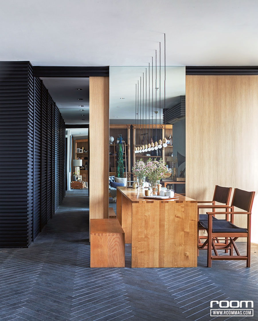 ไหน ๆ พื้นที่การใช้งานก็อยู่ใกล้กันแล้ว ทําไมไม่ลองเชื่อมฟังก์ชันให้ต่อเนื่องกันเพื่อประหยัดพื้นที่ เช่น การรวมพื้นที่นั่งเล่นกับโต๊ะรับประทานอาหารไว้ด้วยกัน โดยเปลี่ยนจากโต๊ะกลางแบบเตี้ยมาเป็นโต๊ะ อาหารที่สูงขึ้นในระดับที่พอดีกับโซฟาและอาร์มแชร์ในห้องรับแขก เปลี่ยนให้เป็นมุมอเนกประสงค์ที่จะใช้นั่งเล่น รับแขก รับประทานอาหาร หรือจะนั่งทํางานก็ได้ แต่ถ้าต้องการความกลมกลืน แนะนําให้ทําเฟอร์นิเจอร์บิลท์อินขึ้นมาใหม่ โดยออกแบบให้เป็นโซฟานั่งเล่นขนาดยาว ด้านข้างต่อเป็นโต๊ะรับประทานอาหาร นอกจากมีฟังก์ชันครบครันในหนึ่งเดียว ยังช่วยให้ห้องมีพื้นที่รอบ ๆ เพิ่มขึ้นด้วย