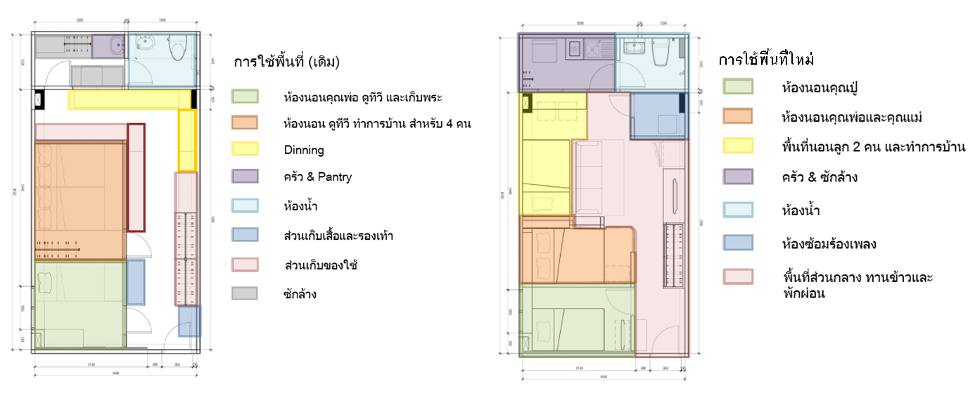 การแก้ปัญหาจึงอยู่ที่ การกำหนดฟังก์ชั่นการใช้งานบนความต้องการลำดับแรกที่ว่า “ทุกคนมีพื้นที่ส่วนตัวที่ไม่รบกวนซึ่งกันและกัน” การออกแบบพื้นที่ภายในห้องจึงใช้การจัดสรรผังพื้นภายในให้เป็นสัดส่วนในสไตล์โรงแรมแบบญี่ปุ่น ที่แบ่งย่อยทุกส่วนให้ใช้ประโยชน์ได้เต็มที่ทุกตารางนิ้ว มีทั้งพื้นที่ส่วนตัวที่แต่ละคนทำกิจกรรมของตนเอง ในขณะเดียวกันก็มีพื้นที่ส่วนรวมที่ใช้งานร่วมกันได้ด้วย