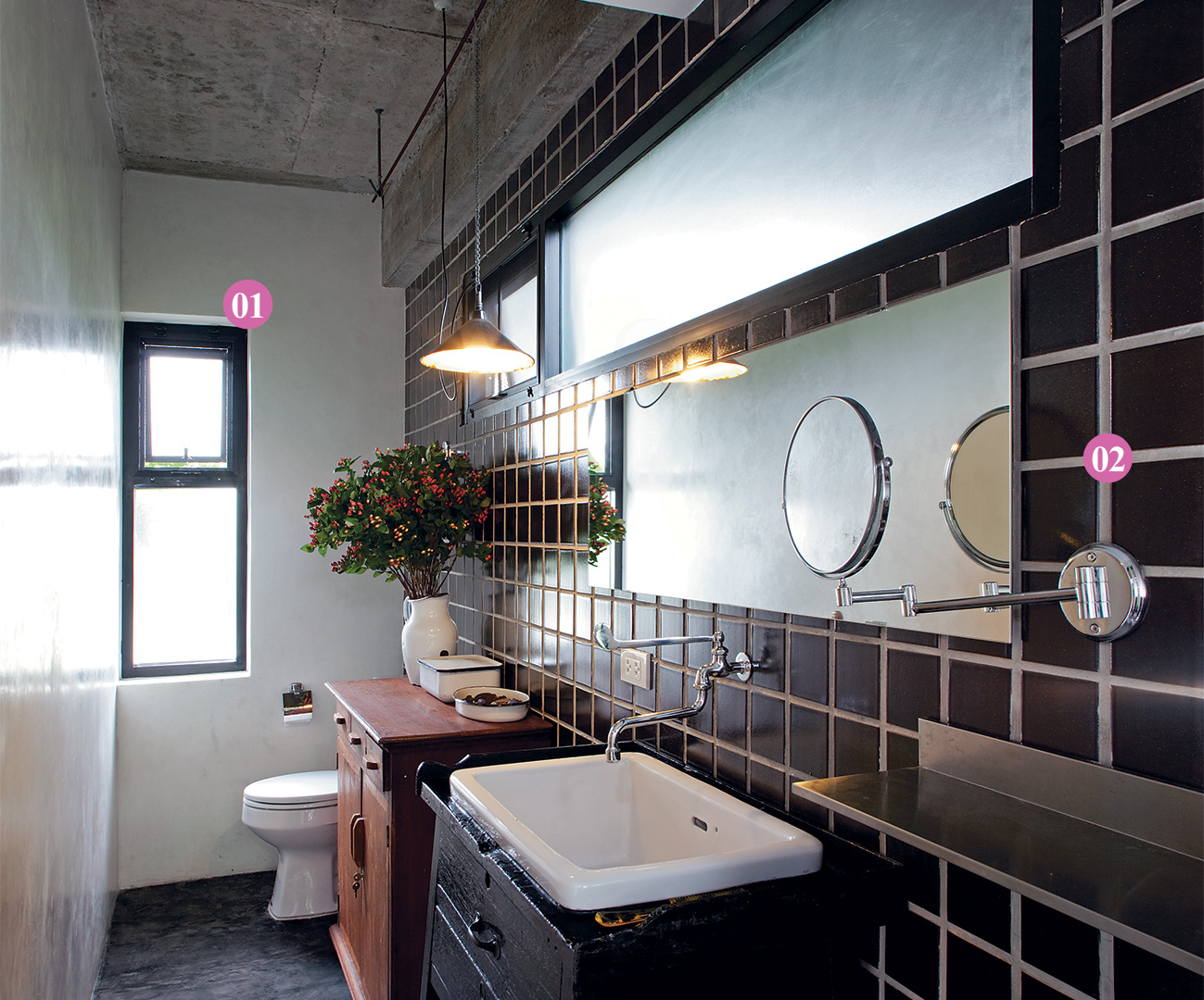 ลองจับแมทีเรียลชนิดอื่นหรือฟังก์ชันแบบใหม่มาช่วย ให้การใช้งานในห้องน้ำง่ายดายขึ้น ได้ทั้งความสะดวก และสวยงามแปลกตา จากที่เคยใช้ประตูบานสะวิง บานใหญ่บานเดียว ลองเปลี่ยนเป็นบานผลักแบบคู่ทําด้วยแผ่นเหล็ก ก็ได้อารมณ์อินดัสเทรียลเท่ ๆ หรือใช้ผ้าใบรวบเก็บแบบผ้าม่านหน้าต่างก็เก๋ไก๋ไม่ซ้ำแบบใคร