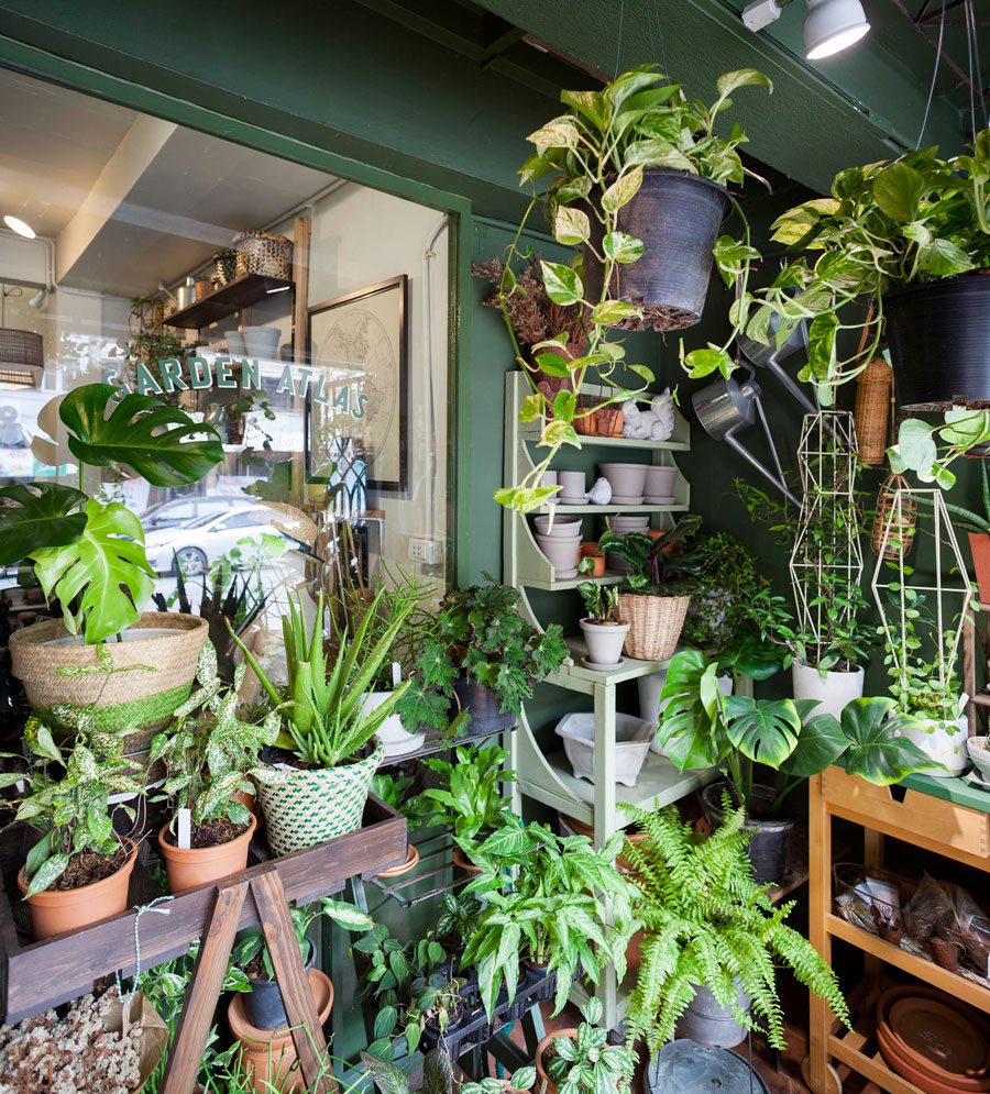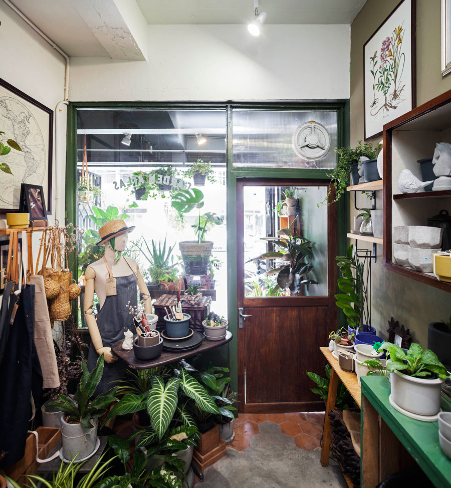 ตึกแถวหนึ่งคูหาที่อัดแน่นไปด้วยต้นไม้หลากหลายชนิดทั่วทุกมุมของร้าน จัดวางคู่กับของแต่งสวนต่างๆที่มีให้เลือกสรรมากมาย เน้นเป็นกระถางในสไตล์มินิมัลที่มีทั้งเจ้าของร้านผลิตขึ้นมาเองและไปเลือกมาจัดวางที่ร้าน ซึ่งนอกจากจะเป็นร้านขายของตกแต่งสวนทั่วไปแล้ว ยังเป็นพื้นที่ที่จำลองเสมือนบ้านในเมืองให้ลูกค้าเข้ามาชมไอเดียการตกแต่งพื้นที่สีเขียวนำไปใช้ต่อกันได้ครับ