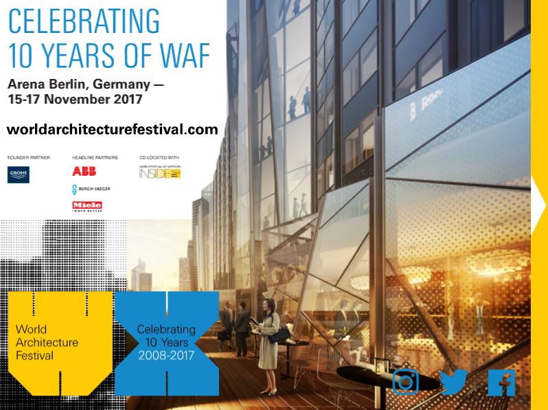 และในปีนี้งาน World Architecture Festival 2017 ได้เกิดขึ้นเป็นปีที่ 10 แล้วถือเป็นการเฉลิมฉลองความสำเร็จและเป็นที่รู้จักในระดับสากล โดยจัดขึ้นระหว่างวันที่ 15-17 พฤศจิกายน 2560 ที่ Arena Berlin กรุงเบอร์ลิน ประเทศเยอรมนี ซึ่งมีกิจกรรมที่น่าสนใจ อาทิ กิจกรรมสัมมนาทางการออกแบบจากสถาปนิกผู้ทรงคุณวุฒิ , Berlin Architect Tours พาชมสถาปัตยกรรมต่างๆในกรุงเบอร์ลิน , Finalist Showcase ที่รวบรวมผลงานสถาปัตยกรรมมาจัดแสดงในรูปแบบนิทรรศการ เป็นต้น
