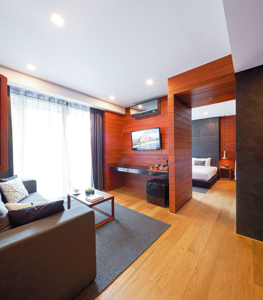 การตกแต่งภายในใช้โทนสีขาว เทา และดำ ควบคู่ไปกับการใช้ไม้และหินเป็นวัสดุปูพื้นและกรุผนังห้องบางส่วนเพื่อให้ผิวสัมผัสที่เป็นธรรมชาติและอบอุ่น ให้บรรยากาศเหมือนอยู่บ้านมากขึ้น เช่นเดียวกับเฟอร์นิเจอร์ที่เป็นวัสดุไม้และบุผ้า แต่เลือกใช้รูปทรงที่มีกลิ่นอายความเป็นโมเดิร์น จึงไปด้วยกันได้ดีกับภาพรวมของอาคารและการตกแต่งภายใน ภายในห้องพักแต่ละห้องมีการกั้นห้องใหม่ทั้งหมดเพื่อให้ได้พื้นที่ใช้สอยที่กว้างขวางมากขึ้น รวมไปถึงระเบียงและกระจกใสที่เปิดรับแสงภายนอก ทำให้บรรยากาศภายในไม่อึดอัดจนเกินไป ทั้งยังสามารถเปิดออกไปชมวิวทิวทัศน์ของเมืองและภูมิทัศน์ของสวนส่วนกลางได้อีกด้วย