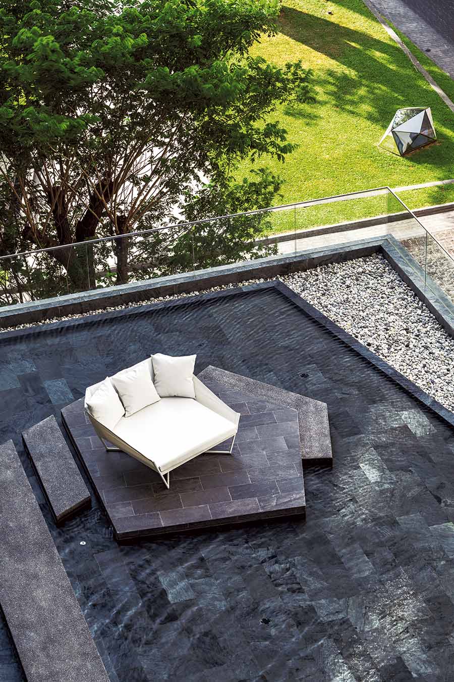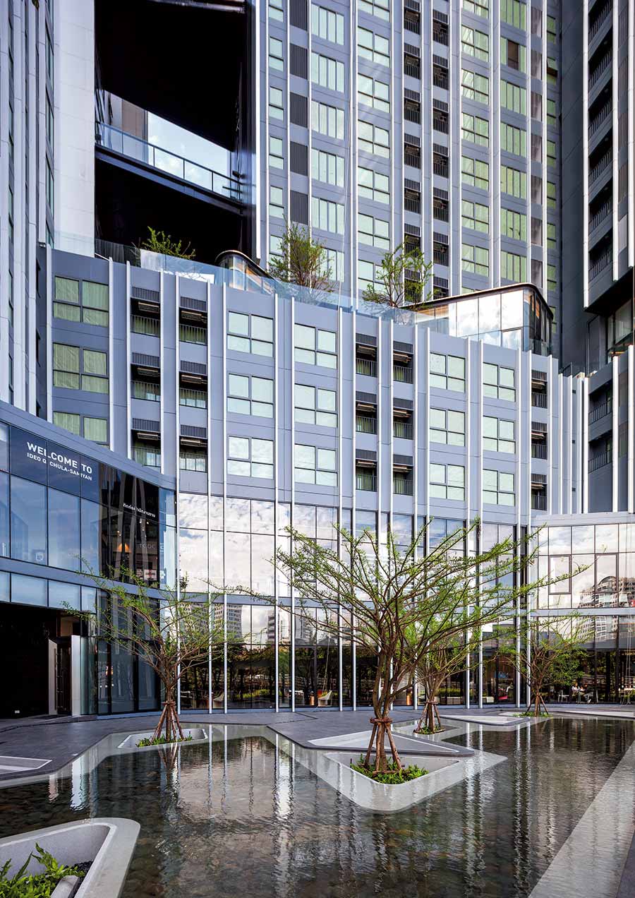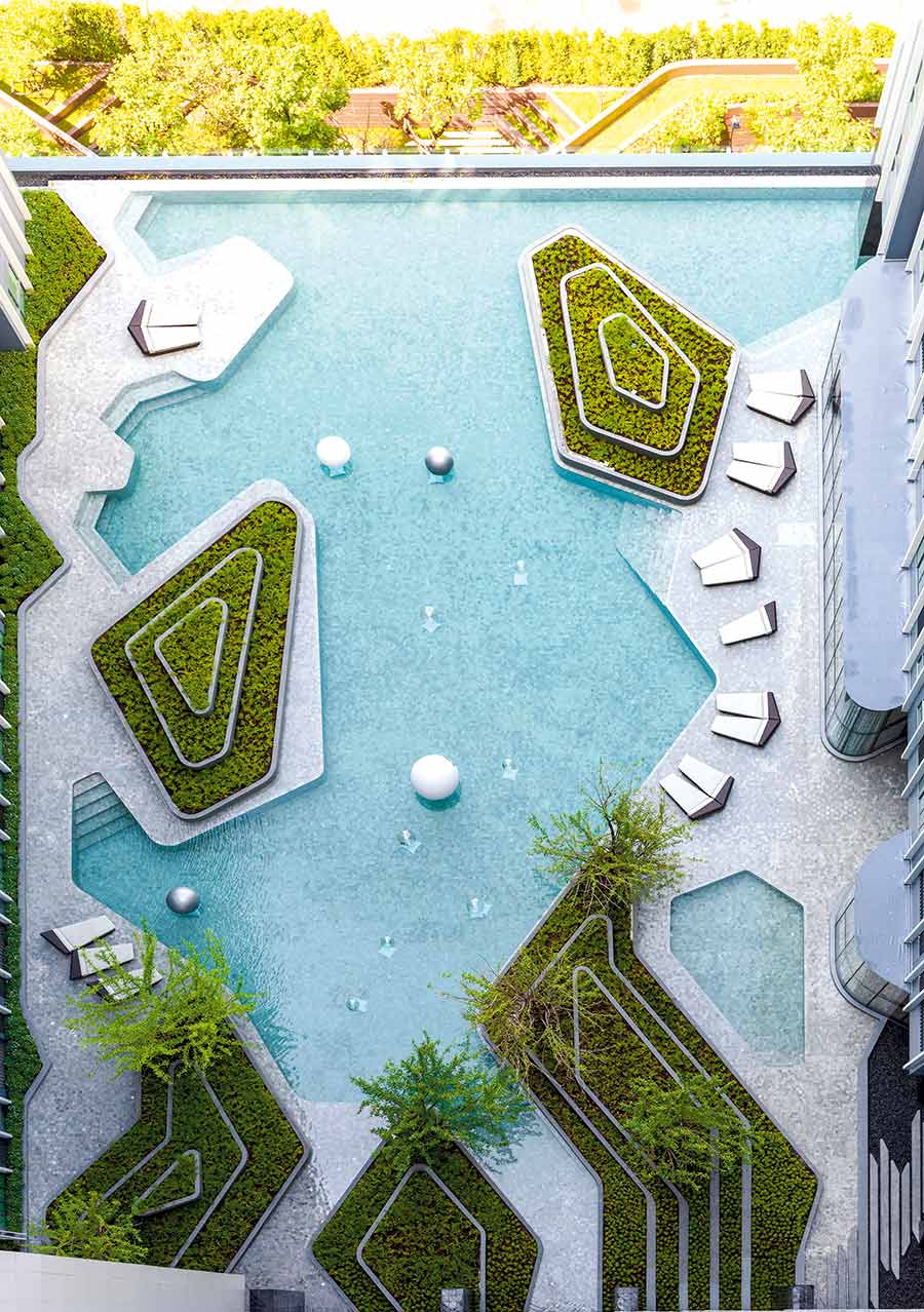 ผู้ช่วยคืนความสดชื่นยามคุณกลับบ้านด้วยความเหนื่อยล้าชั้นดีคือพื้นที่สีเขียวขนาดใหญ่ด้านหน้าคอนโด IDEO Q จุฬาฯ-สามย่านที่ผสานบ่อน้ำและงานฮาร์ดสเคปลายกราฟิกเข้าด้วยกัน เป็นเส้นสายที่ชวนให้รู้สึกกระตือรือร้นตลอดเวลาอีกทั้งยังเป็นกันชนระหว่างพื้นที่คอนโดกับท้องถนนที่คลาคล่ำไปด้วยมลพิษ มาพร้อมสวนด้านหลังที่ลดทอนมาจากรูปทรงตามธรรมชาติไว้นั่งเล่นพักผ่อน อ่านหนังสือเงียบๆ หรือจะหลบไปว่ายน้ำใน “มหาสมุทร” ผืนใหญ่บนชั้น 7 ของอาคาร