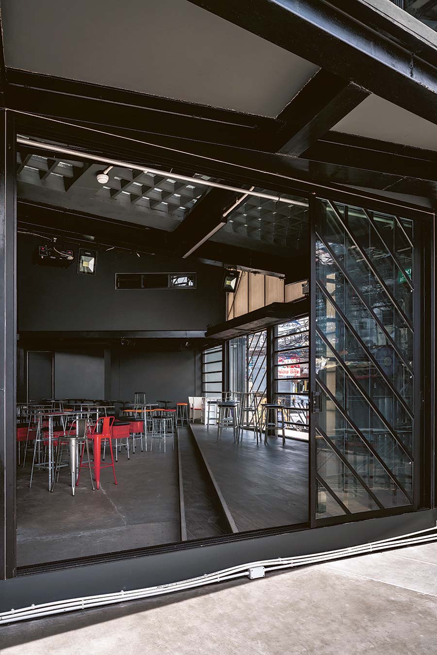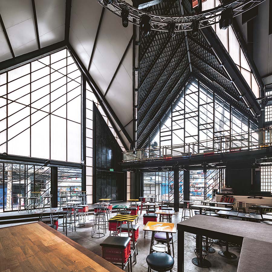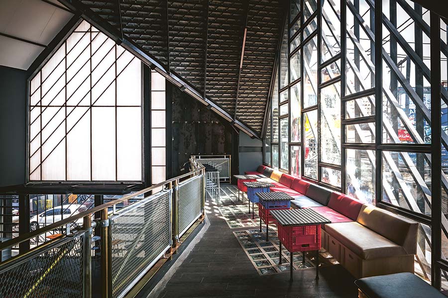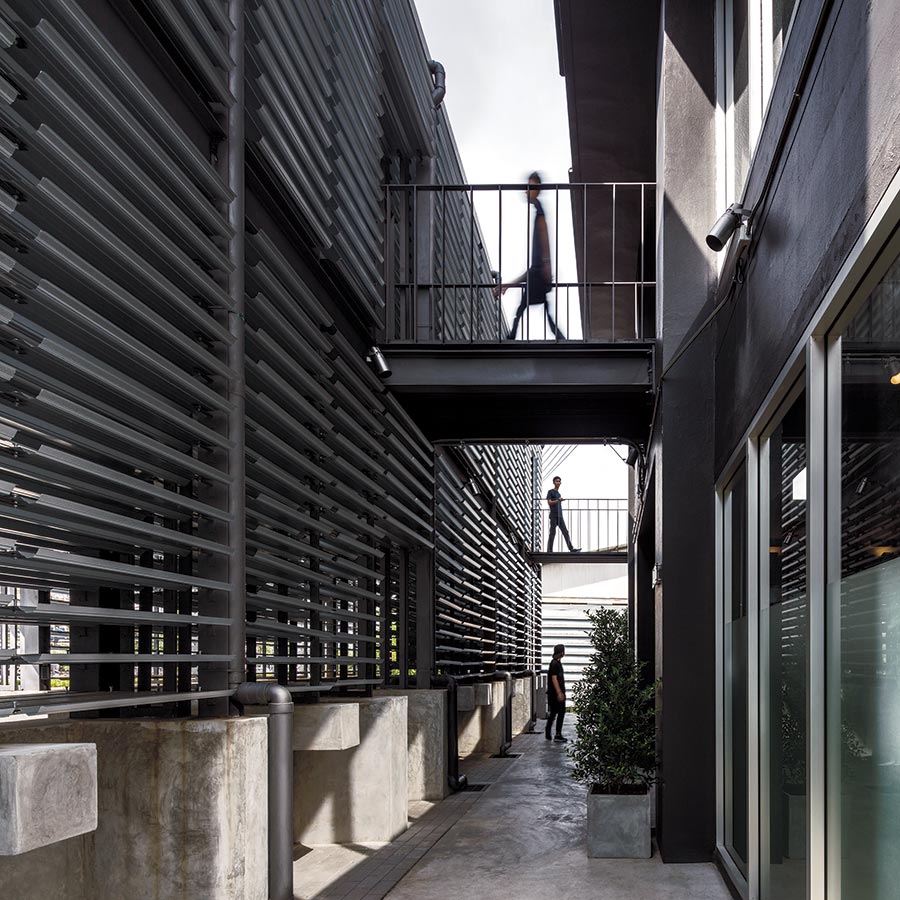ร้านกาแฟสุดเท่ที่เลือกแสดงตัวตนผ่านวัสดุที่หลายคนมองข้าม แต่กลับไม่ธรรมดาอย่างเมทัลชีท ทำให้ได้เห็นศักยภาพของวัสดุที่สามารถนำมาประยุกต์ใช้เป็นส่วนเติมเต็มงานออกแบบ จนเกิดเป็นแพตเทิร์นสวยงามดึงดูดทุกสายตา และยังช่วยสะท้อนแสงและความร้อนไม่ให้เข้าสู่ตัวอาคาร โดยมีแสงเงาเป็นของแถมช่วยเพิ่มเสน่ห์และมิติให้แก่พื้นที่ และเพื่อความรวดเร็วในการก่อสร้าง เลือกทำโครงสร้างอาคารจากเหล็กทั้งหมดการออกแบบจึงใช้เวลาเพียง 4 เดือน และลงมือก่อสร้างจริงอีก 4-5 เดือน