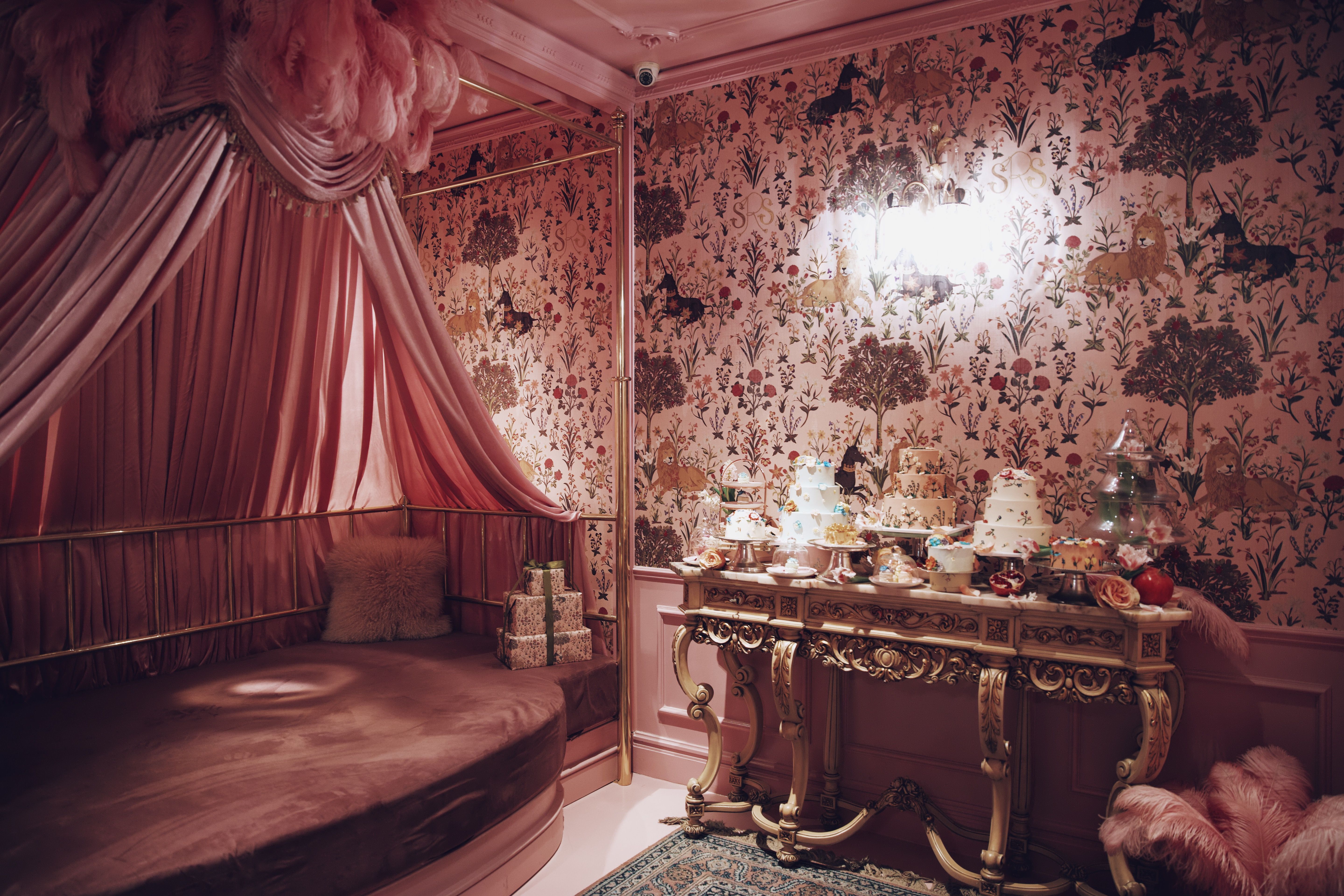 ในห้องรับรองสีชมพู ออกแบบให้เป็นห้องรับแขกพิเศษที่ทุกอย่างเป็นสีชมพูพาสเทล ตั้งแต่ผนัง เฟอร์นิเจอร์ รวมถึงของตกแต่งรวมถึงชั้นวางเค้กที่เปรียบเสมือน showcase ไอเดียการตกแต่งเค้กลวดลายต่างๆที่กลมกลืนไปกับลวดลายพริ้นต์ที่ใช้ตกแต่งร้าน