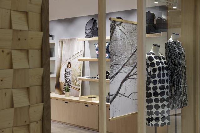 Marimekko Concept Store Central Bangna คุมโทนด้วยการเลือกใช้วัสดุอย่าง ไม้สีอ่อน เพื่อสร้างบรรยากาศดูอบอุ่น สะอาดตา อีกทั้งภายในร้านเน้นความมินิมัลและนุ่มนวลด้วยการประดับแสงไฟและเฟอร์นิเจอร์ในบ้าน พร้อมการจัดวางสินค้าแบบ showcase บริเวณมุมต่างๆภายในร้านให้ผู้ซื้อสามารถเลือกชมและเลือกซื้อกันได้ทั่วถึง และไฮไลท์อีกอย่างหนึ่งที่ปรากฎเด่นชัดผ่านการออกแบบหน้าร้าน ที่ใช้การตัดต่อท่อนไม้ให้เกิดแพทเทิร์นเรียงต่อกันให้ความรู้สึกเสมือนงานหัตถกรรมไม้สาน ประดับด้วยตักอักษรชื่อร้านสีขาวซ่อนไฟทำให้ดูโดดเด่น มีมิติและสะท้อนถึงความเป็นสแกนดิเนเวียนที่แสนละมุน